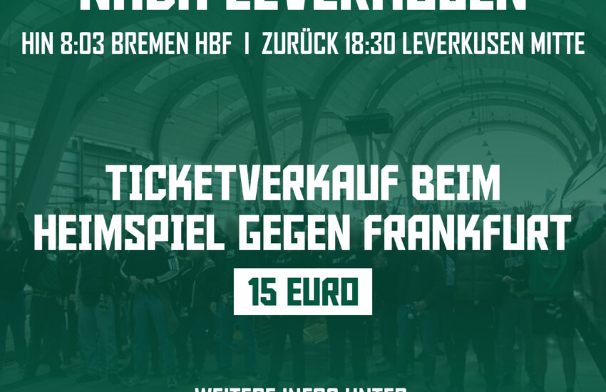 Moin Werderfans! Zum Auswärtsspiel in Leverkusen wird es einen Entlastungszug geben. Dieser kostet 15€ pro Person. Das Zugticket gilt für die Hin- und Rückfahrt. Den Ticketverkauf findet ihr morgen gegenüber